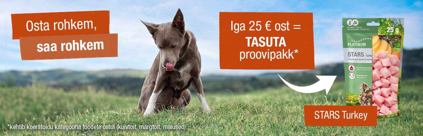 • Iga 25 € väärtuses koeratoidu kategooria toodete ostul saab kingituseks ühe Platinum Stars Turkey maiuse proovipaki (25 g). Kingituste arv sõltub ostusummast ning suureneb proportsionaalselt iga täiendava 25 € kohta (nt 50 € ostuga 2 kingitust, 75 € ostuga 3 kingitust jne)..