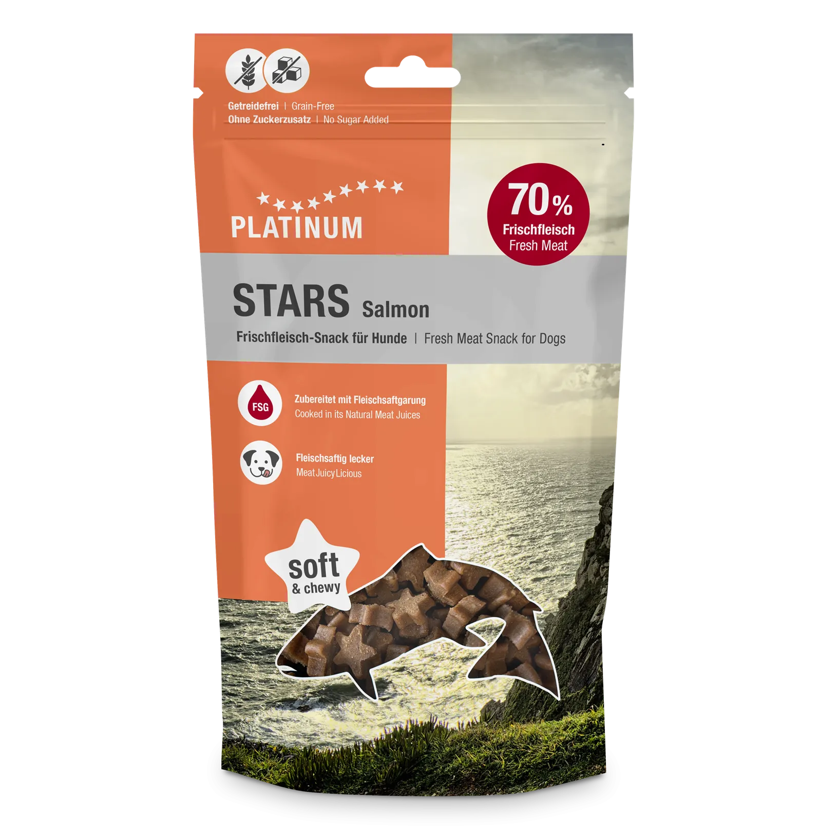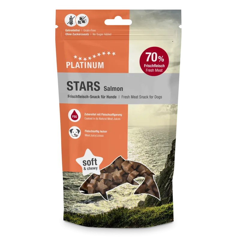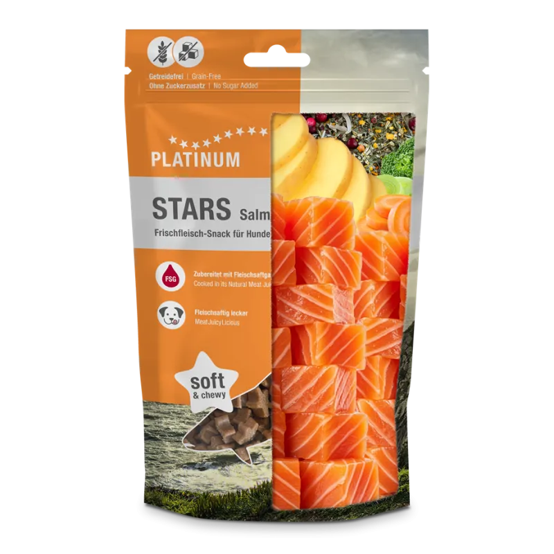 Platinum STARS Salmon maiused on valmistatud värskest lõhest unikaalse FSG meetodi järgi. Platinumi maiuspalad on vastupandamatult maitsvad ja kergesti seeditavad.