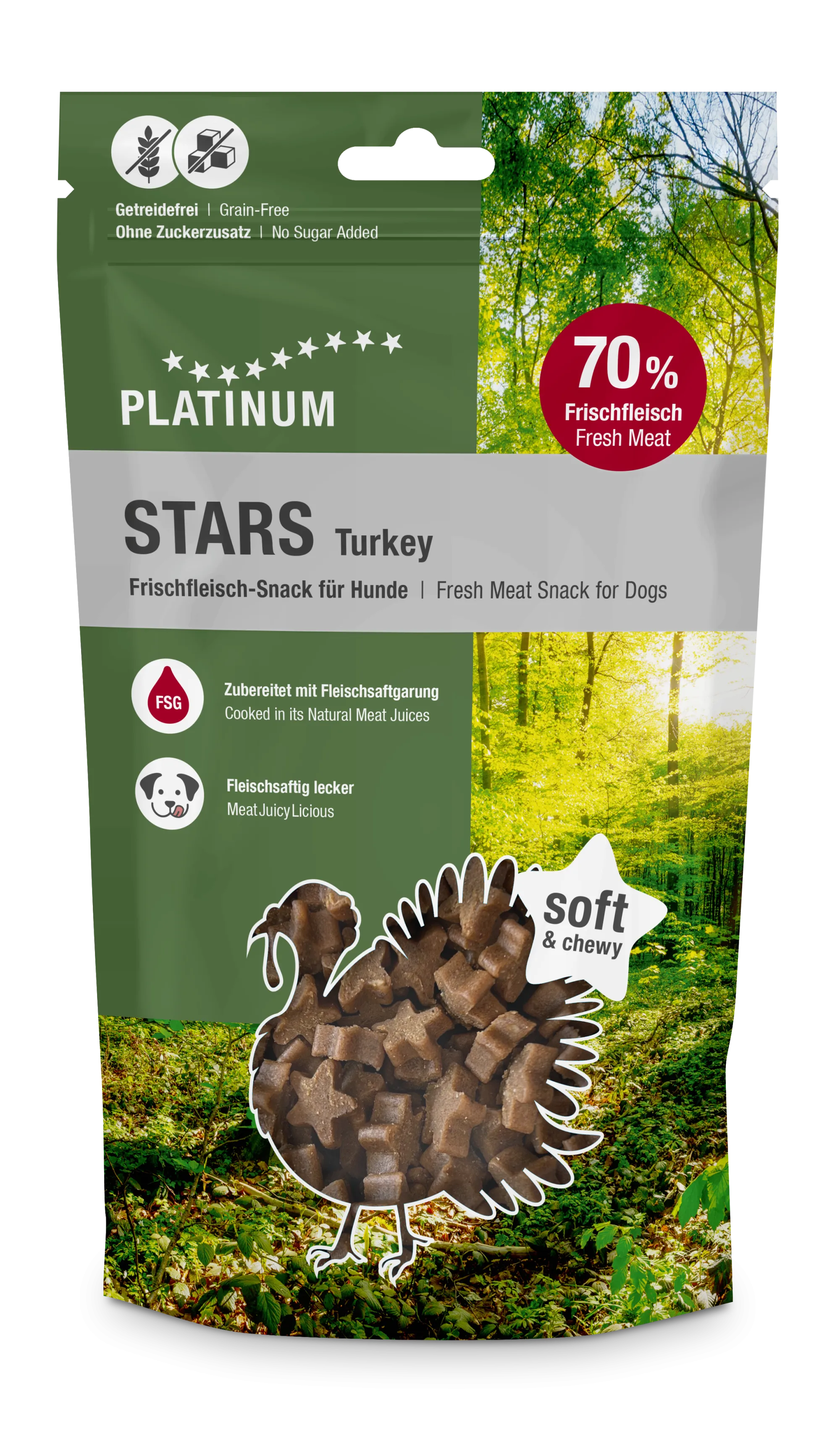 Platinum STARS Turkey maiused on valmistatud värskest kalkunilihast unikaalse FSG meetodi järgi. Platinumi maiuspalad on vastupandamatult maitsvad ja kergesti seeditavad.