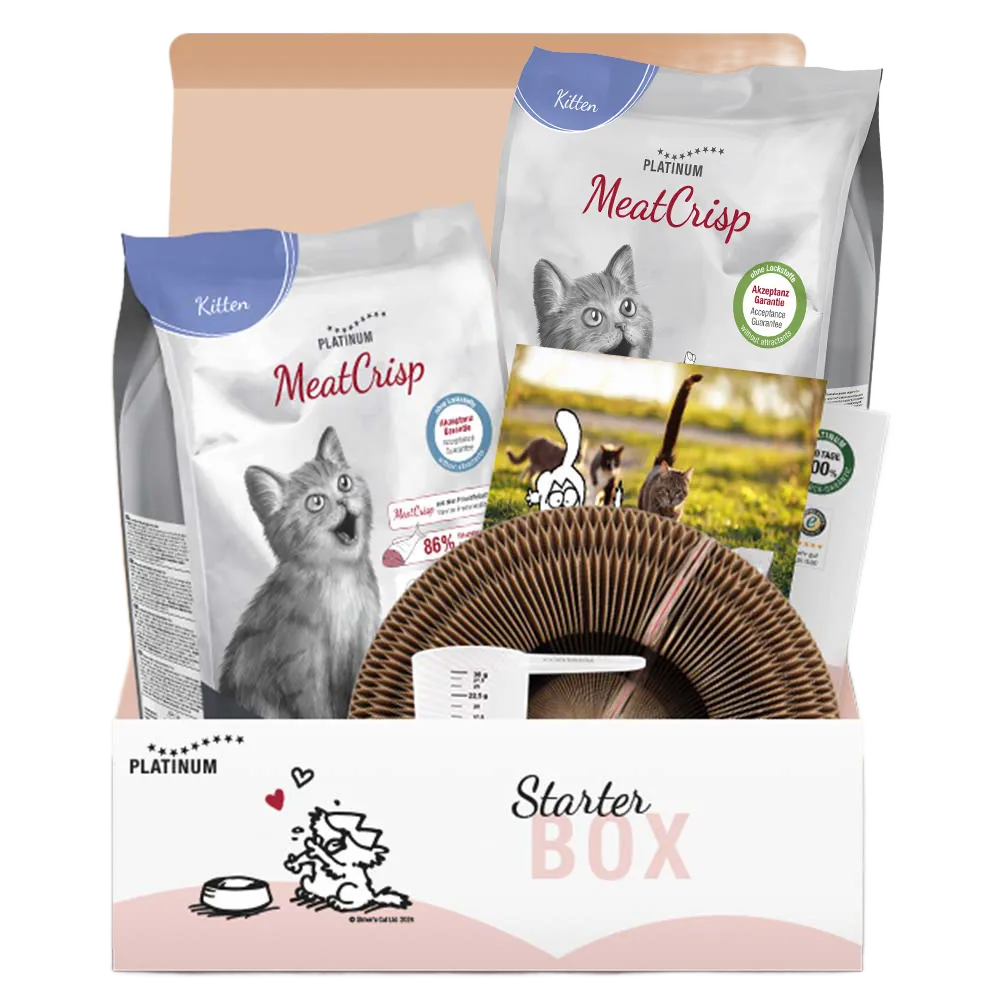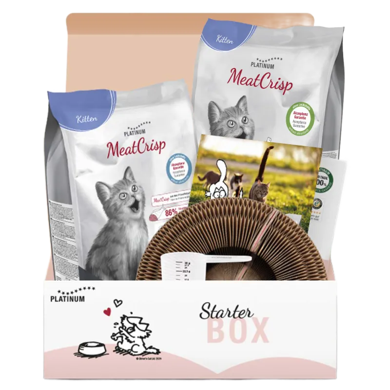 В стартовый набор входят сухой корм PLATINUM MeatCrisp с курицей и рыбой, когтеточка-карусель с игрушечным мячиком, мерный стакан и подробные информационные брошюры.